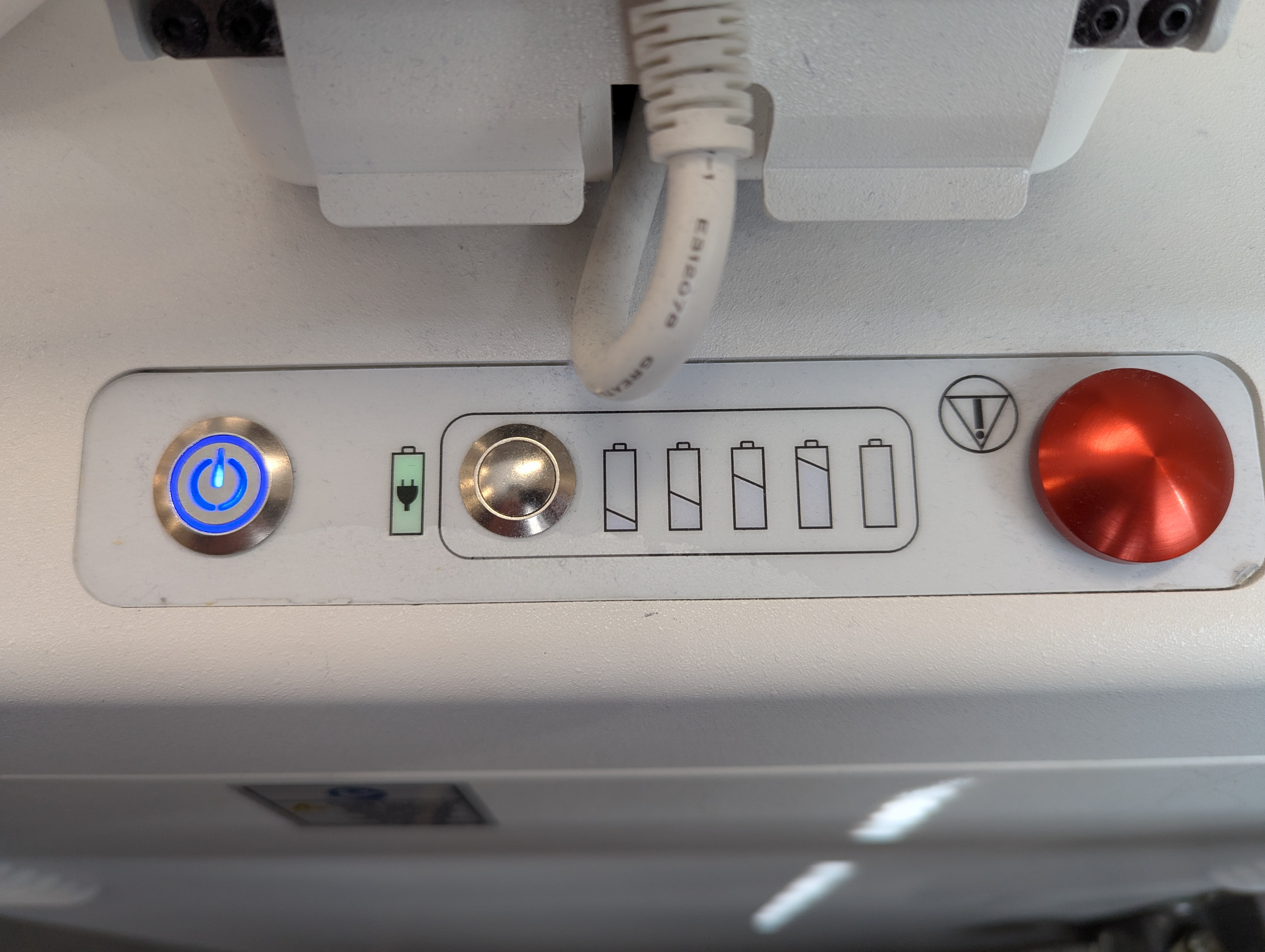 IMPORTANT: The O Arm has a very small relative battery capacity. It MUST be plugged into the MVS and charging (green battery lit up) at all possible times to ensure there are no issues. If you absolutely must have the O Arm disconnected and not charging, it is best practice to turn it off so that the battery does not drain. Keeping in mind that it will take about 5 minutes to start back up.